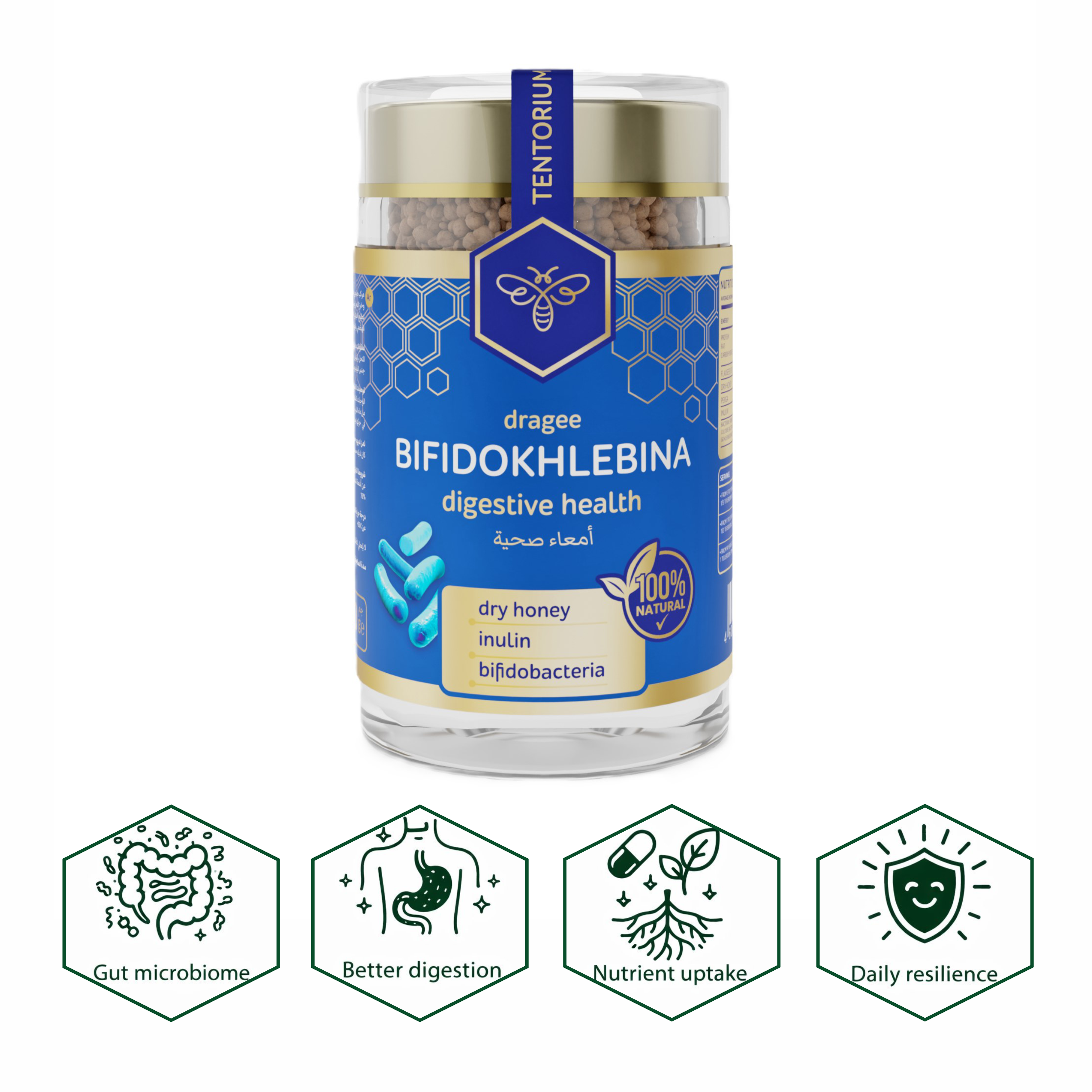 This natural complex contains prebiotics, probiotics, honey, and perga — helping to normalize cholesterol levels, regulate blood sugar, and reduce the risk of malignant formations.