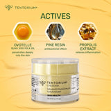 Each ingredient brings unique benefits: propolis helps relieve inflammation, honey nourishes the skin, and pine resin protects from germs.
